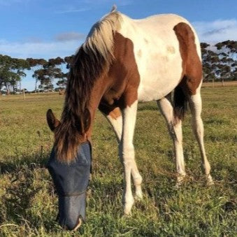 The Australian Made "Flyveils by Design" Flyveil with an extended nose cover that is contoured around the horses nostrils, is designed for effective protection from insects and the sun especially for horses and ponies with white face markings.