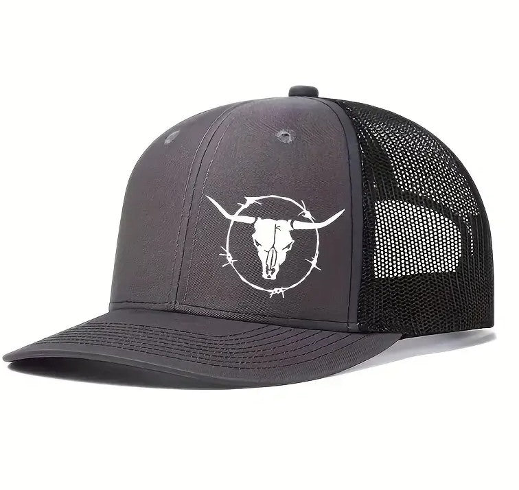 This men's gray trucker cap features a striking printed bull head enclosed within a barbed wire design, capturing a rugged country spirit. Its breathable mesh back keeps you cool, while the adjustable snapback ensures a comfortable, custom fit. Perfect for those who love authentic country style with a bold edge.