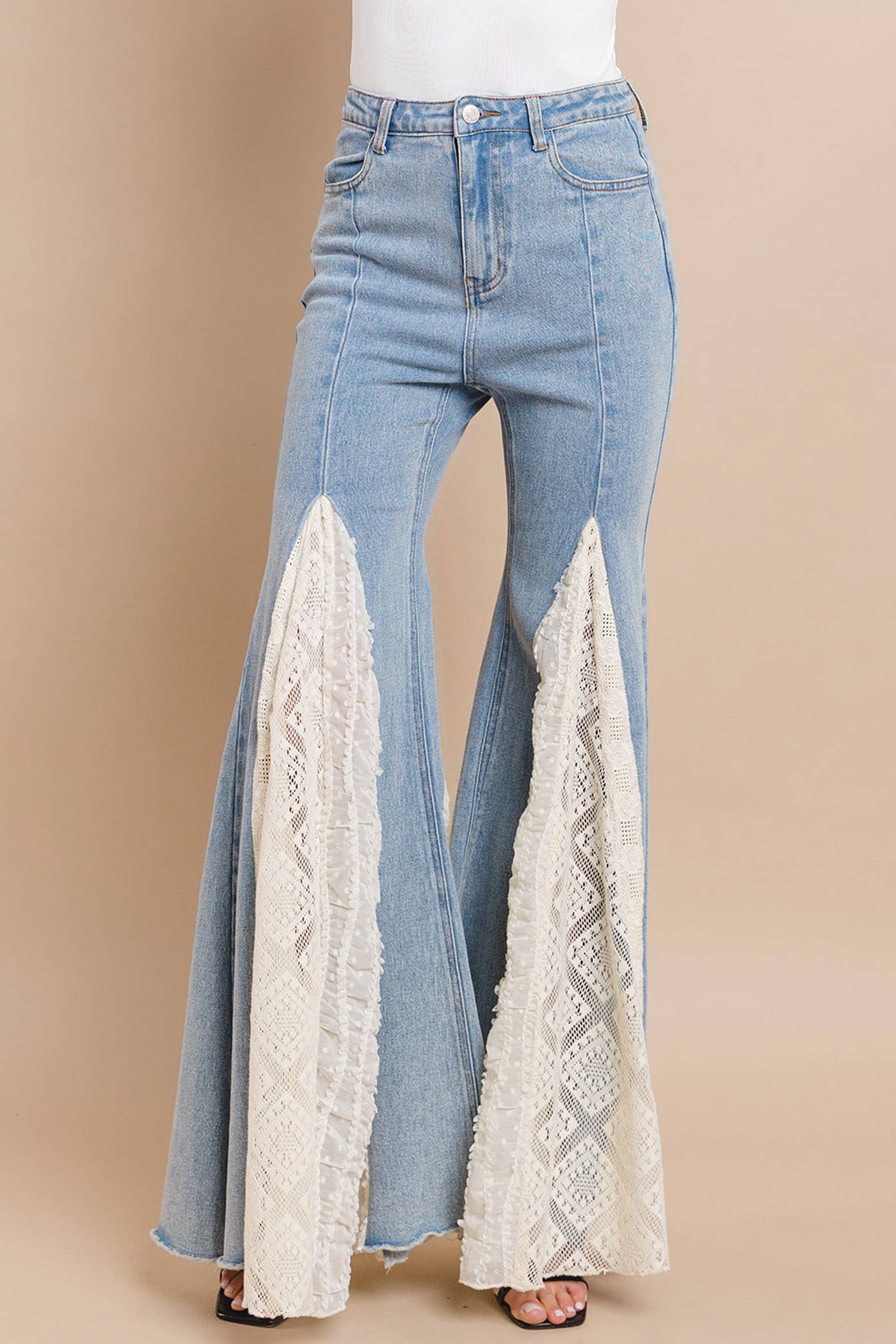 Elevate your denim collection with these mixed-media wide-leg jeans featuring delicate lace detailing. The asymmetrical contrast lace panels add a boho-chic edge, while the stretchy waistband and comfortable stretch fabric ensure all-day wearability. Designed with front pockets and a classic zipper fly, these statement jeans transition effortlessly from festival grounds to everyday wear. Perfect for those seeking vintage-inspired style with a modern twist.