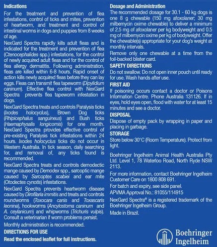 NexGard Spectra is a premium parasite treatment for dogs, offering fast-acting, long-lasting protection for a full 35 days. Its delicious beef-flavoured chew makes monthly dosing simple – no messy spot-ons, no tablets to hide, and no need for separate heartworm medications.